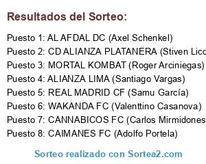 Lista de participantes: ALIANZA LIMA (Santiago Vargas), CAIMANES FC (Adolfo Portela), MORTAL KOMBAT (Roger Arciniegas), WAKANDA FC (Valenttino Casanova), CD ALIANZA PLATANERA (Stiven Licona Jr.), AL AFDAL DC (Axel Schenkel), CANNABICOS FC (Carlos Mirmidones), REAL MADRID CF (Samu García).