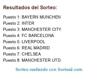 Lista de participantes: REAL MADRID, FC BARCELONA, BAYERN MUNCHEN, CHELSEA, LIVERPOOL, MANCHESTER CITY, MANCHESTER UTD., INTER.