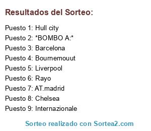 Lista de participantes: *BOMBO A:*, Hull city, Bournemouut, Chelsea, Internazionale, Barcelona, Rayo, AT.madrid, Liverpool.
