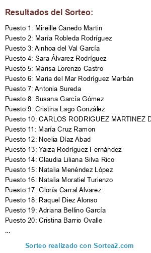 Lista de participantes: María Isabel Lorenzo Álvarez, Feli Montecino Garcia, Paula López Sande, paula augusto, Carmen Rodríguez Martinez, Ainhoa del Val García, Marisa Lorenzo Castro, Zulema Prado Martínez, Amaia Filibi López, Lorena Fernandez Freire, Claudia Liliana Silva Rico, Verónica Ciprián Montes, Lago Domínguez María Isabel, Mencía Tahoces Ovalle, Raul Martínez fernandez, Pilar Gómez-Borrero Herreros de Tejada, Antonia Sureda, Mercedes Castro Lamas, CARLOS RODRIGUEZ MARTINEZ DE CARNEROS, susana alvarez piña, Valentina Trabucco Madriz, Ainoa Gonsalvez Barreiro, Noelia Díaz Abad, López López Luz María, Geli Trabadelo, Mireya Delgado Barreira, Raquel Diez Alonso, Cristina Lago González, Maria del Mar Rodríguez Marbán, Sara Álvarez Rodríguez, Loly Narváez Ruiz, Gloría Carral Alvarez, M. Dolores Trabadelo Fernández, Luz Marina Parrilla Cano, Tania Perón Prada, Paula Covadonga Ruiz Caballero, Sandra De Arriba Fidalgo, Beatriz Fernández Sanz, Cindy Victoria Ribeiro da Silva, Miriam Figueiredo de Pina, Eugenia Camiña, María Alonso Martín, Aitana Lago Sánchez, Susana García Gómez, Natalia Moratiel Turienzo, Pilar, Yolanda Fernández Aguilera, Valeria Yáñez Merayo, Guillermo Gonzalez Coronado, Melissa gonzalez narvaez, Patricia Rodríguez Rodao, Marta Cuadrado Cao, ESTEFANIA NIETO, Paula Abella Moreda, Sena López Fernández, Víctor, Rebeca, Itziar López, Alejandro Acebedo Alonso, Rosy cerqueira, Daniel Rodríguez García, Mireille Canedo Martin, Adriana Bellino García, Cristina Arias Vega, Patricia blanco barredo, Carolina ALVAREZ ALVAREZ, Yaiza Rodríguez Fernández, María Robleda Rodríguez, Ainoa Iglesias Abril, María Uría García, Verónica Luis Martínez, Natalia Menéndez López, Nuria Muñoz Mata, Sílvia Hernandez Vega, Maria fe Rodríguez García, Diana Goncalves, Wendy Castro Meneses, Andrea Menéndez González, Sara Velasco Garcia, Sara Rodríguez Trabado, Nicolás Vázquez, Suly Estefanía Valencia Quintero, Blanca Rodríguez Fernández, Estefania Tabuyo Iglesias, Cristina Barrio Ovalle, Marta Álvarez Barrio, Cristina Blanco Franesqui, Claudia Blanco Franesky, Andrea López Pereira, DAVID LOPEZ, Lorena Digón Fariñas, Aurora Carballo, María Cruz Ramon, María José escribano Quintanar.