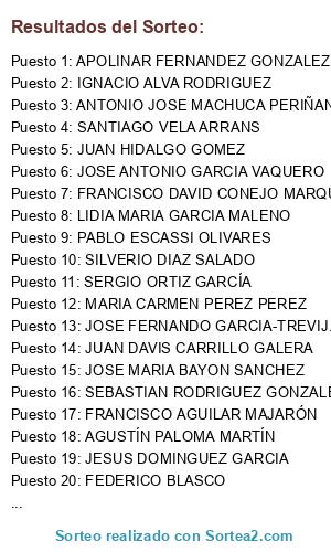 Lista de participantes: ALFONSO VERDUGO JAIME, ANDRES SEGURA AVILA, ANGEL SANCHEZ PADILLA, ANTONIO JIMENEZ RAMOS, ARACELI SUAREZ SANCHEZ, CARLOS BERBEL FERNANDEZ, CARMELO TORRES GARCIA, DAVID RODRIGUEZ RODRIGUEZ, DIEGO CAPARROS GEREZ, EVA ALONSO FORTE, FEDERICO ALONSO CAYUELA, FERNANDO ESPINAR MOLINA, FRANCISCO VALVIA BAYO, GINES J FERNANDEZ PEREZ, IGNACIO FERNANDEZ VERA, JESUS LARA CRESPO LOPEZ, JESUS MARIA PEREZ DE PERCEVAL DIAZ, JOSE ANTONIO GARCIA OCON, JOSE ANTONIO GARCIA VAQUERO, JOSE LUIS QUIRANTES RUIZ, JOSE MARIA MARTINEZ MALDONADO, JUAN AMATE FRANCO, JUAN ANTONIO BARRANCO ARMENTEROS, JUAN DAVIS CARRILLO GALERA, JULIO TORRES CARALLOR, LUIS MIGUEL PARIS LOPEZ, LUZ MARIA FERNANDEZ AGUILERA, MAITE MIRAS SENES, MANUEL ALONSO PORCEL, MANUEL MONTOYA SANCHEZ, MANUELA PORCEL ROMAN, MARI CARMEN CORTES SANCHEZ, MARIA LUISA CIRUGEDA MOTOJO, MARIANO FERNANDEZ MARIN, MIGUEL BELTRAN LOPEZ, SEBASTIAN RODRIGUEZ GONZALEZ, ANGEL MARQUEZ HORRILLO, ANTONIO MORENO BASALLOTE, BORJA MANRIQUE PLAZA, EDUARDO ORTEGA GONZALEZ DEL VAL, FCO. JAVIER SALES ALMOGUERA, FERNANDO MUÑOZ BARAJA, FRANCISCO JAVIER VERDÚ BAEZA, FRANCISCO RODRÍGUEZ HEVIA, IGNACIO CASTRILLÓN FERNANDEZ, JAVIER ARAGON GARCIA, JAVIER SALDAÑA CORRALES, JOSE ANTONIO GONZÃLEZ HERRERO, JOSE FERNANDO GARCIA-TREVIJ. FERNANDEZ, JOSE LUIS CUEVAS GARCIA, JOSE MARIA OTERO-SAAVEDRA, JOSE MIGUEL SANTIAGO COSSI, JUAN CARLOS ARANDA ARENILLAS, JUAN LUIS JIMÉNEZ RODRÍGUEZ, Mª DE LOS SANTOS GONZALEZ VIRUEZ, MIGUEL ANGEL GOMEZ HINOJO, PEDRO LUIS COLLADO TOLEDO, RAFAEL LOPEZ ALVAREZ, RAFAEL MARTINEZ DEL VALLE, ALICIA MORENO CASTRO, ANTONIO PÉREZ, CARLOS JAÉN TOSCANO, CARLOS JESÚS CORRAL BAENA, CARLOS MARIN BELLIDO, CATALINA POZUELO TORRALBO, CRISTOBAL MARTIN AGUILERA, EMILIO NAVARRO, EUSEBIO SALAMANCA, FERNANDO ANGULO TORRALBO, FRANCISCO JOSÉ NAVARRO ESQUINAS, GREGORIO OCAÑA AGUILERA, JESUS EVARISTO PEREZ NARVAEZ, JOAQUÍN FERNÁNDEZ CARRILLO, JOSE ANTONIO RUIZ SÁNCHEZ, JUAN HIDALGO GOMEZ, MANUEL GARCIA MEDINA, MARÍA INMACULADA JIMÉNEZ HITA, MIGUEL CADENAS DE LLANO SOSA, RAFAEL GARCÍA PRIETO, SANDRA LUQUE, ADELA DEL ROSARIO NAVARRO GARCIA, ALEJANDRO JOSE SAN MARTIN DIAZ, ANTONIO JAVIER SANCHEZ MARTIN, ANTONIO JOSE MACHUCA PERIÑAN, ANTONIO MANUEL AGUILAR MEGIAS, ANTONIO SANTIAGO ORTEGA, CARLOS LUQUE CAMPAÑA, CHRISTIAN ENRIQUE DE SEVERAC CANO, CRISTINA BELEN GARCIA COLORADO, CRISTINA JIMENEZ GARRIDO, DAVID NAVARRO CAPILLA, ELVIRA SUAREZ CARMONA, EMILIO GARCIA VILLALTA, EMILIO PEREZ JIMENEZ, ESTER ROSARIO ROMERO RUIZ, FABIOLA MORENO MEDINILLA, FRANCISCO JOSE MORALES ROMERO, FRANCISCO JOSE SANCHEZ ESTEVEZ, ISABEL EGEA FLORES, ISIDRO MOLEON PAIZ, JESUS DOMINGUEZ GARCIA, JESUS MIGUEL JIMENEZ ESCAMILLA, JORGE CASTELLANOS LOPEZ, JORGE CRIADO PEREZ, JOSE LUIS MARISCAL VICENTE, JOSE MARIA SANCHEZ ORTIZ, JOSE MIGUEL JIMENEZ DIAZ, JOSE RODRIGUEZ VARGAS, JOSE ROMERO MALLORQUIN, JUAN DE DIOS LARIOS LOPEZ, JUAN RAMÓN MEDINA POLO, JULIAN GARCIA DIAZ, LEONARDO CESAR GUARDIA GARCIA, LORENZO SOLANO GARCIA, LUIS GUILLERMO ARJONA IZQUIERDO, MAGDALENA LORCA GARCIA, MANUEL JESUS MIRA MARTIN, MANUEL MARTINEZ MADRID, MARCOS CULEBRAS PALAO, MARIA AUXILIADORA SANCHEZ CASTRO, MARIA DOLORES GIMENEZ FERNANDEZ, MARIA JOSE ARROYO GUERRERO, MARIA JOSE GRANIZO DIAZ, MARIA TERESA FLORES VILAR, MARIA TRINIDAD LAGUNA HARO, MARIÁNGELES RUIZ JIMÉNEZ, MARTIN JESUS LOPEZ CORRAL, MIGUEL A. ENAMORADO ARANDA, MIGUEL ANGEL MOLES QUITIAN, MIGUEL ANGEL SALVATIERRA MESA, MIRIAM RUIZ CRESPO, MONICA MORENO SOTO, PALOMA GARCIA MOLINA, PAULINO V. BAENA LOPEZ, PEDRO JOSE DE LA O GARCIA, RAFAEL GIRON FERNANDEZ CRE., ROCIO GUZMAN ARIAS, SANDRA MARIA NAVARRO JIMENEZ, DAVID MARTINEZ POZO, FRANCISCO JOSE RUFINO DURAN, FRANCISCO RICO RODRIGUEZ, JOSE GOMEZ DOMINGUEZ, JOSE JULIAN PAMPANO GARCIA, JOSÉ MARIA MARTINEZ SOUSA, JUAN MANUEL RODRIGUEZ MURIEL, MARIA DEL MAR ROJANO GARCIA, NOELIA MARIA SANTANA GOMEZ, SIMON GUERRA RODRIGUEZ, ENCARNACION CORTES PRIETO, FRANCISCO JAVIER FERNANDEZ DONCEL, MANUEL ANGEL GILA GONZALEZ, RAMON GARCIA MATEO, ADRIAN BLANCO ROSADO, ADRIAN GIL VERA, ADRIANO ALBERTO PEREZ LOPEZ, ALEJANDRO MALDONADO RODRIGUEZ, ALFONSO JOSE JANEIRO RODRIGUEZ, ALVARO FDEZ DE LIENCRES AGUILO, ANA MARIA TORCUATO TRIGUERO, ANTONIO FCO. GEA MUÑOZ, ANTONIO FERNANDEZ FORNIELES, ANTONIO NARANJO SANCHEZ, APOLINAR FERNANDEZ GONZALEZ, BEATRIZ BENITEZ GARCIA, DAVID LOPEZ MORENO, ENRIQUE AGUILAR VEGA, FATIMA ARIAS GARCIA, FERNANDO DIAZ ESCOBAR, FRANCISCO DAVID CONEJO MARQUEZ, FRANCISCO F. GUTIERREZ CRUZ, FRANCISCO GIL MARQUEZ, FRANCISCO JAVIER ARCAS PEREZ, FRANCISCO JAVIER CALVO CAZALLA, FRANCISCO JAVIER RUIZ MARIN, FRANCISCO MIGUEL PEREZ NODA, FRANCISCO PEREZ SERRANO, JESUS CABRERA LOPEZ, JORGE DIAZ LOPEZ, JORGE MACIAS MORENO, JOSE ALFONSO ALISES SUAREZ, JOSE ANTONIO CONDE HEREDIA, JOSE ANTONIO SALAZAR REY, JOSE CHICON JIMENEZ, JOSE IGNACIO ARANDA CASAS, JOSE LUIS ALFONZO LEON, JOSE LUIS GARCIA CHILLON, JOSE MARIA GUTIERREZ CANO, JOSE MARIA PAREDES SANTOS, JUAN DOMINGO RUIZ DE MIER, JUAN JOSE TRUJILLO CEBRIAN, LIDIA MARIA GARCIA MALENO, LORENZO JOSE FUENTES HIDALGO, LUIS ALFONSO MARTIN DELGADO, LUIS CASTILLA ESTEVEZ, MANUEL A. RODRIGUEZ FERNANDEZ, MANUEL RAMOS GIL, MANUEL ROMERO TORRES, MARIA CARMEN PEREZ PEREZ, MARIA DEL MAR SOLIS MARTIN, MARIA ISABEL HERROJO MILLAN, OLGA PEREZ ZAFRA, PABLO ESCASSI OLIVARES, PABLO RAFAEL PASTOR VEGA, PEDRO GONZALEZ-TORUÑO PEREZ, RAFAEL REYES MORENO, RAUL CORBACHO LEDESMA, RAUL JALON NEIRA, RICARDO JIMENEZ MARTIN, RICARDO PASCUA MANZANO, ROCIO LARA BUENO, ROSANA VALENZUELA CASTILLO, SALVADOR GOMEZ RANDO, SERGIO CUBO CLEMENTE, SILVERIO DIAZ SALADO, TRINIDAD ORTIGOSA MELENDEZ, VICENTE ALGABA HERRERO, VICENTE PABLO GONZALO MARIN, YOLANDA TRUJILLO DOMINGUEZ, AGUSTÍN AGUSTÍN FERRERA DOMÍNGUEZ, AGUSTÍN PALOMA MARTÍN, ALBERTO BERNABÉU, ALBERTO TEROL PEDRERO, ALEJANDRO LUCIANO BERNARDEAU CLÉRICI, ALICIA DOMINGO TORRECILLAS, ALMUDENA LABOISSE RODRIGUEZ, ANA MARIA GONZALEZ, ANGEL BALLESTEROS RODRIGUEZ, ANTONIO ALFONSO CASAS SANCHEZ, ANTONIO BARRAGAN CASTAÑO, ANTONI