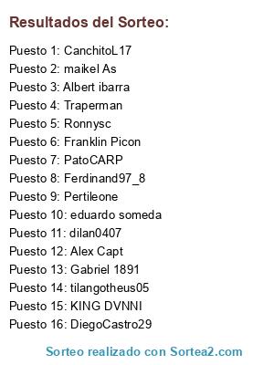 Lista de participantes: tilangotheus05, Ferdinand97_8, Alex Capt, PatoCARP, Albert ibarra, Ronnysc, KING DVNNI, dilan0407, DiegoCastro29, CanchitoL17, Gabriel 1891, maikel As, eduardo someda, Franklin Picon, Traperman, Pertileone.