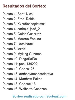 Lista de participantes: anthonymonestelaraya, papu139202, Myking Guzman, Xxpuñosdeplataxx, lexdal, LocoIsaac, Fredi Ralda, Matthew Paker, Moreno Espuna, Cheque 16, Walberto Cabezas, DiegoSalDu, Guido Gutierrez, carbajal josé_2, Choca123, Santi Nico.