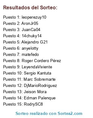 Lista de participantes: Roger Cordero Pérez, Sergio Kantuta, RodrySC8, JuanCa04, matefedo, Edman Palenque, 14chuky14, DjMarioRodriguez, anyelotty, AronJr05, Marc Sobremarte, Jeison Mora, leoperezuy10, LeyendaViviente, Alejandro G21.