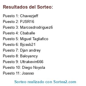 Lista de participantes: Marcosdrodriguez6, Miguel Tagliafico, Diego Noyola, Chavezjeff, Baloyancy, Joasso, Bjcssb21, PJSR16, Djan andrey, Ultrakevin666, Cbaballe.