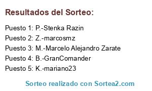 Lista de participantes: A.-mistiko_1972, B.-GranComander, C.-estanild2, D.-JSDRAKE, E.-C. A. Huracan, F.-vincent14(D), G.-rosariocanalla, H.-Doncella Carol, I.-Leuhen, J.-Tairefer, K.-mariano23, L.-gbarberon, M.-Marcelo Alejandro Zarate, N.-gonza40, Ñ.-fernetzero, O.-Tuttee, P.-Stenka Razin, Q.-Leo Howell, R.-Nazareno1982, S.-Artigascba, T.-empaladeradefede, V.-Virak, U.-P0L4CC, W.-Gugatzu, X.-Zek Punga, Y.-Sebastianolazabal, Z.-marcosmz, AA.-FUERZAINMORTAL, BB.-cneyra, CC.-Dragoshark 3.0.