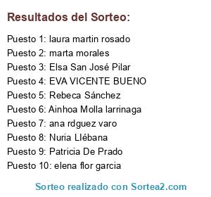 Lista de participantes: Laura Sancho, carmen pajueli, Ruth Valladares, antonio jose martin porras, rosa ansa carrera cougil, Susana Navarro, IDOIA MORENO, BEGONYA PUJOL GARCIA, maria luz ceballos garcia, patricia vivas velasco, Mariel Serrat, Begoña collazo ortega, nuria Gamazo Martínez, Maria de Fátima Baptista Morgado Magro, Cristina Rojo Seco, Jenny Perez Diaz, Sara Camisón Criado, amaia guillen, ANA GARCIA ORTIZ, Eugenia Puertas, SUSANA Rey Garcia, Beatriz Barreales Rueda, Encarnación Gullón Arias, Arantxa San Martin, Claudia Muñoz Martin, alejandra matera gomez, María Ruz L-e, Gemma Bosch, Maria Teresa González Gelado, MCarmen Garres, María Teresa Rodríguez rubio, Fátima Lago Soriano, SUSANA FERRE LLAMAS, María José Romero Ubeda, Sara Martínez Herreria, Hortensia Parreño Montero, cristina sanchez, Georgina Gonzalez, Susana Chavez Gasulla, Jeannette Letelier, israel garcia nogal, maria jose lopez velasco, Verónica Ruiz, Orosia Torralba, Esther martinez, clara gonzalez, Luz Maria Sánchez Díaz, cleide diniz, Eva Maria San Jose, Gema Valdes Barbao, vanessa Valentín, celeste sanchez maset, Milagros Vidal, davinia herrera guedes, Mari Angeles Vazquez, Miriam Suarez, Crystal Sevilla, Mª Ines Gil Gonzalez, Nieves Sanchez Zamora, Asunción Molina Alonso, jose luis portela rubio, Angelines Gaspar Vargas, mari carmen aguila, Antonio Melero Requena, Gema Garrido alvarez, Laura Bonillo Flor, María Rocío García Paz, Verónica grados, Judith maylinch carrasco, Sol Rodriguez, Vanesa Sanchez, susana laguna pardo, CARLOS NUÑEZ SANCHEZ, RAQUEL Mesonero ORDOÑEZ, trini lopez, ANTONIA MUÑOZ, Gloria Urquidi Fernandez, vanessa vallejo, Yaiza María Gómez, MAGDALENA MILLAN CORRERO, lina rengifo, Estrella Souto Meizoso, ma carmen sanchez, lourdes guijarro, noelya de la paz cortes, ANA BELEN CARRAMOLINO RUIZ, MARIA DEL MAR HERNANDEZ PEREZ, Eloy Mejuto, Isabel García Romero, miguel puente valcarce, maria blanca, Cristina Fortes Carrion, Blanca Turrillo, CRISTINA VELA, Raquel Valle, Celia Domínguez Sánchez, Maria cruz Rodríguez Cabrera, Montserrat Maso Tarres, ana bella sierra sierra, Carlos Manuel Latorre Manresa, francisco zarate castillo, Jessica Garcia, Isabel Carricondo Romera, Raquel Morante, Belen Suiza, Yolanda García, conchi blazquez avis, Gemma Mª Raya Lara, ESPERANZA SALAS, Laura Lucas Sánchez, María Jesús Buedo, loli perez, Susana Fajardo López, Alina Vázquez Berbel, alicia casillas, Marta Villalibre, Maria Gutiérrez, Rosmari GarcIa Escobar, yolanda paniagua villlaespesa, leticia garcia, Francis Moreno, MARIA AMPARO FUENTES ARES, Josep Maria Viladot, patricia garcia marroquin, Ruth Diaz, marina rojas, Ana Espejo Toro, Noelia Romero, Laura López Martínez, Anna Pepió, AliciA Cabrera alvarez, Elisa Picado Picazo, inmaculada Ruiz gutierrez, Andreina Elias, tamara castellano, Chari Moreno, Goyi Bautista, rosario reyes, Cynthia Gijon Cardeñas, Laura Raby, Maria Jose Garcia, SILVIA DE PEDRO GONZALEZ, Sandra Hop Tambini, Isabel ruiz estepa, Mari Carmen García Sáez, Cristina Pérez, María Francisca Andrade hita, jesus torres ruiz, Amparo Yañez, monica González, Esperanza Portillo Garcia, montserrat vicente, veronica lloret, Rocío pedrajas, maria isabel medina, belen retana, Gema Gutierrez, maricarmen ramos, Beatriz Sanz Arranz, Juan Angel Martinez Sanz, Jorge Martínez Sanz, Antonio D. Sanchez, Meritxell Coma, Laura carrio tent, Tamar Simón Gómex, cris asensi, Mercedes Vargas Robles, maría victoria rodríguez zamora, Carolina Navarro, Carolina Aranda Vega, David Manso, Diana Sánchez, Lorena Garcia Rodriguez, Rebeca Camarena Martinez, Mari Angeles Martinez Hernando, enri acaiña, Sonia Bravo, prado arenas Lázaro, laurindo de andrade, Lidia Lg, cristina castro medio, Gabriela Sánchez, yolanda matias, magdalena gonzalez conde, Mónica Moya Herrezuelo, Lidia Gea, montserrat vaño, Beatriz Rodríguez, Isabel Cristina Silva Volta, montserrat cano, Iris Arandia Carolini, Alba Gomez, Veronica Mateo, Ana Burgos, Elena urbano galeano, raquel campos lage, Ave Vila-Coro, Juani Araque, Alba Jaimes Jaimes, Tania Martos Pino, Meritxell Batlle, m carmen sobrino astillero, aroa loza, nelida langa, Julián del Río Mangas, María Ángeles Nasarre Pérez, Laura Rubín, E Jose Alvarez, Yolanda Alonso Gallardo, Noemí Alba Blanco, MARISA FERNANDEZ MIRANDA, María de la Concepción Vidal Troitiño, Jezabel Martinez, elisabet soler, maria del pilar garcia, alicia lopez alabau, Vanesa miguez, Conchi Gómez Martín, Susana Carrascal, Sandra Lera, Marisa Ortega, Silvia Valiente illescas, maria arellano, Begoña López Ferrer, Aroa Aleixandre, Ursula Laguna Rodríguez, Mª BELEN DEL BLANCO TORICES, elena hernandez gonzalez, Ana isabel García gil, lucia garcia fernandez, Amaya Navarro, Petra Martín Martín, Pilar Galváñ Navarro, Leticia Portela, IRENE ROSA MARTINEZ, Lorena García Martín, Vanesa Lopez Garcia, Ana Biedma, Jennifer Barela, MARTA LOZANO ARELLANO, Victoriana Barrera barba, Lucia De Monti, ana paula ramos pires, olga Vazquez Gordillo, Remedios Lovillo Atienza, Patricia Miranda, Conchi Gómez Sánchez, Mónica Saa, vanessa Rodriguez alonso, CRISTINA RODRÍGUEZ, Esther Bordallo, Alicia De Luque, Isabel Alvarado Díaz, soledad fayula izquierdo, rebeca hevia-campomanes rubio, Maria Nievas, Paloma Jiménez, araceli lopez cañete, Laura Fernández Rodríguez, mari luz ocampos vega, Núria Amenós, Maite Llorach, Jose Pacheco, Natalia Caballero, Esther Castello, Carmen Martín, toñi solis senso, angeles sánchez sicilia, Nora Gordo Rodríguez, raquel sancho torregrosa, Verónica Ballester, sonia caballero, ana belen sardiña lopez, Carmen Bonafe Ramos, leticia vicente garcia, natividad gomez cordero, raquel caselles, sheyla juliá alegre, zahara garzon, Natalia Torres, YOLANDA PERALTA NOGUES, zuriñe matellanes, Isabel Lapido, Cristina Esteller, Laia Pamies vidal, loli berlinches, Raquel Ruipérez, sandra molist, Maria Valiente, Sandra Postigo Cayon, Cristina Corcoles, 