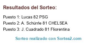 Lista de participantes: J. Cuadrado 81 Fliorentina, Lucas 82 PSG, A. Schürrle 81 CHELSEA.