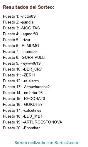 Lista de participantes: -lagmor80, -INSKI77, -linares35, -EDU_MB1, -irizar, -ralalarcn, -ignaciovp, -Enosthar, -aandia, -NENECR7, -nefertari26, -EHB_KIKE, -RECOBA20, -soylaguia, -ELMUMO, -ELOSKARON, -GURRIPULLI, -MOGITAS, -ZER11, -ARTUROESTONOVA, -reywwf619, -franciskiko_8, -BER_CR7, -GOKUH27, -Roberto_69_89, -Achachancha2, -calcetines, -Dmolina87, -victor89, -MARIO_LR.