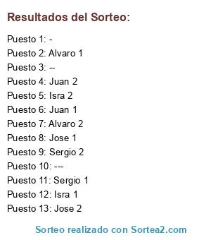 Lista de participantes: Juan 1, Juan 2, Jose 1, Jose 2, Isra 1, Isra 2, Alvaro 1, Alvaro 2, Sergio 1, Sergio 2, -, --, ---.