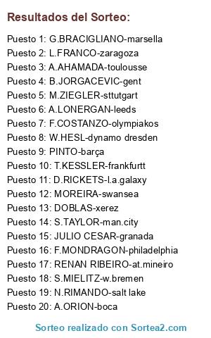 Lista de participantes: DOBLAS-xerez, L.FRANCO-zaragoza, PINTO-barça, JULIO CESAR-granada, S.TAYLOR-man.city, MOREIRA-swansea, D.RICKETS-l.a.galaxy, T.KESSLER-frankfurtt, A.LONERGAN-leeds, A.AHAMADA-toulousse, M.ZIEGLER-sttutgart, A.ORION-boca, F.COSTANZO-olympiakos, RENAN RIBEIRO-at.mineiro, B.JORGACEVIC-gent, N.RIMANDO-salt lake, F.MONDRAGON-philadelphia, W.HESL-dynamo dresden, S.MIELITZ-w.bremen, G.BRACIGLIANO-marsella.