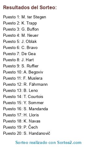 Lista de participantes: M. Neuer, De Gea, T. Courtois, P. Čech, H. Lloris, S. Handanovič, J. Hart, G. Buffon, B. Leno, R. Fährmann, C. Bravo, S. Ruffier, S. Mandanda, J. Oblak, K. Navas, M. ter Stegen, K. Trapp, F. Muslera, Y. Sommer, A. Begoviv.