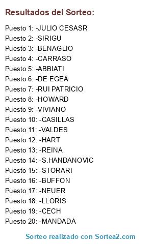 Lista de participantes: -BUFFON, -CASILLAS, -NEUER, -JULIO CESASR, -S.HANDANOVIC, -CECH, -VALDES, -HART, -SIRIGU, -ABBIATI, -REINA, -STORARI, -VIVIANO, -LLORIS, -RUI PATRICIO, -HOWARD, -BENAGLIO, -CARRASO, -MANDADA, -DE EGEA.
