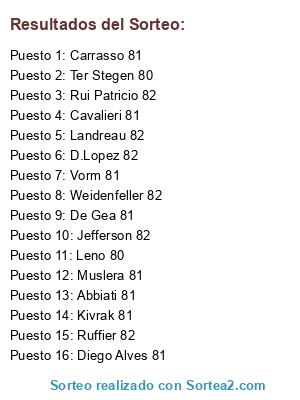 Lista de participantes: Casillas 88, Buffon 87, Neuer 86, Lloris 85, Hart 84, Cech 84, Valdes 84, Sirigu 84, Adler 84, Marchetti 84, Courtois 83, J.Cesar 83, Reina 83, Handanovic 83, Akinfeev 83, Mandanda 83.