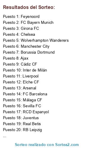Lista de participantes: Inter de Milán, FC Bayern Munich, Real Betis, Wolverhampton Wanderers, Liverpool, Borussia Dortmund, River Plate, RCD Espanyol, Feyenoord, Manchester United, Málaga CF, UD Las Palmas, Cádiz CF, Atlético Madrid, Elche CF, Juventus, Arsenal, Real Madrid, RB Leipzig, Rayo Vallecano, Milan, Real Zaragoza, Ajax, Girona FC, Chelsea, FC Barcelona, Paris Saint-Germain, Manchester City, Sevilla FC, Valencia CF.