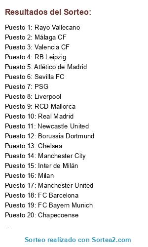 Lista de participantes: Inter de Milán, PSG, Wolves, FC Bayern Munich, Borussia Dortmund, Valencia CF, RCD Mallorca, Newcastle United, Manchester United, Málaga CF, Chapecoense, Levante UD, Liverpool, Chelsea, Manchester City, Real Madrid, RB Leipzig, Rayo Vallecano, Milan, New York Red Bulls, FC Barcelona, RCD Espanyol, Sevilla FC, Atlético de Madrid.