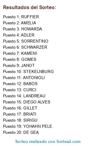 Lista de participantes: HOWARDA, BRIATI, DE GEA, LANDREAU, KAMENI, GILLET, JANOT, SORRENTINO, SIRIGU, ANTONIOLI, CURCI, DIEGO ALVES, RUFFIER, SCHWARZER, AMELIA, ADLER, BABOS, YOHAHN PELE, STEKELNBURG, GOMES.