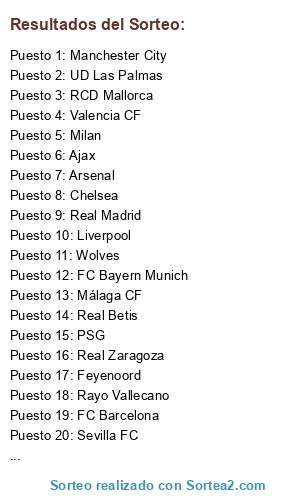 Lista de participantes: WBA, Cádiz, Las Palmas, Milán, Real Betis, Southampton, Ajax, Liverpool, RCD Espanyol, Palermo, Nottingham, Marsella, Chelsea, Morecambe, Juventus, Boca Juniors, Inter, Getafe, Fiorentina, Sevilla, Atlético, Madrid, Mallorca, Valencia, FC Barcelona, Arsenal, Hamburgo, Atlanta, Bilbao, CSKA.