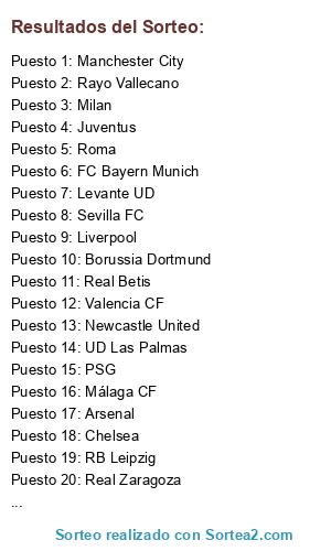 Lista de participantes: Morecambe, BvB, Atlanta, Sporting, Niza, Levante, Rangers, Juventus, Fiorentina, Inter, Milan, Tottenham, Madrid, Betis, Valencia, Espanyol, West Ham, Ajax, Marsella, Mallorca, Manchester City, Roma, Liverpool, Athletic Bilbao, Bayern, Barcelona, Manchester United, Zaragoza, Everton, Leicester.