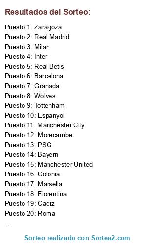 Lista de participantes: Liverpool, Cadiz, Everton, Ajax, Leicester, Atletico, Wolves, BvB, Betis, Morecambe, Levante, United, Niza, Fiorentina, Barcelona, PSG, Madrid, Roma, Bayern, Atlanta, Inter, Marsella, Mallorca, Milan, Valencia, Tottenham, City, Espanyol, Zaragoza, Arsenal.