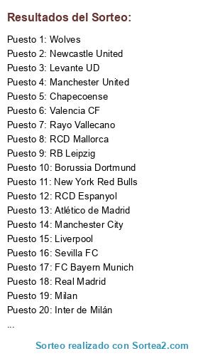 Lista de participantes: Inter de Milán, PSG, Wolves, FC Bayern Munich, Borussia Dortmund, Valencia CF, RCD Mallorca, Newcastle United, Manchester United, Málaga CF, Chapecoense, Levante UD, Liverpool, Chelsea, Manchester City, Real Madrid, RB Leipzig, Rayo Vallecano, Milan, New York Red Bulls, FC Barcelona, RCD Espanyol, Sevilla FC, Atlético de Madrid.