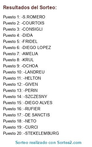 Lista de participantes: -GIVEN, -DE SANCTIS, -FRIDEL, -KRUL, -S.ROMERO, -RUFIER, -SZCZESNY, -AMELIA, -STEKELEMBURG, -DIDA, -DIEGO ALVES, -LANDREU, -CONSIGLI, -NETO, -CURCI, -OCHOA, -PERIN, -COURTOIS, -DIEGO LOPEZ, -HELTON.