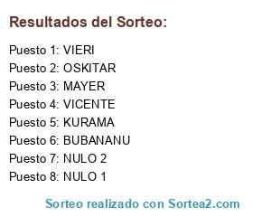 Lista de participantes: BUBANANU, KURAMA, MAYER, VICENTE, OSKITAR, VIERI, NULO 1, NULO 2.