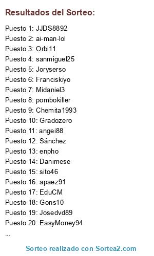 Lista de participantes: Aldipe, Adri_casti90, Josedvd89, ai-man-lol, enpho, Joryserso, pablo1093, Midaniel3, Danimese, Quiron888, Gons10, francisb04, fornides, apaez91, wazo, referee_21, pedroeloy95, danicozarch_25, mangel.sl, EduCM, Chemita1993, Orbi11, leticoes, JJDS8892, angei88, sito46, davidg981, alexmar_93, ellocuhd, JonanPB8, Uve_mula, sanmiguel25, Franciskiyo, EasyMoney94, Lokikolirota, pombokiller, jaimegx_94, Gradozero, Sánchez, Alberto9.