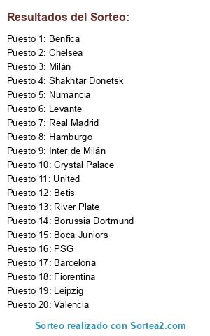 Lista de participantes: Betis, Benfica, Valencia, Levante, United, Shakhtar Donetsk, Crystal Palace, Inter de Milán, Boca Juniors, River Plate, Barcelona, Leipzig, Borussia Dortmund, Hamburgo, Milán, Numancia, PSG, Fiorentina, Real Madrid, Chelsea.