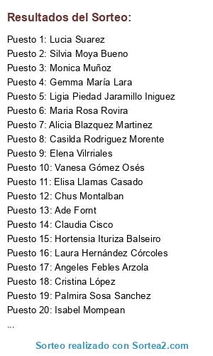Lista de participantes: Pilar Mompean, Mari Carmen Mompeán, Laura Cerezo Álvarez, Laura Madrigal Cánovas, Carmen Perez Martinez, Fuensanta Carceles Lopez, Marian Mateo, Gabriela Adriana Costache, Pilar Miñana Moreno, Sonia Muñoz Guerrero, Pirula Parra Maiquez, Arjona Espejo, Inma Gadea Fabra, Antonia Ortiz, Silvia Moya Bueno, Alicia Blazquez Martinez, Estefanía López Ruiz, Lucia De Bravo, Concha Prados Garcia, Paqui Zamora, Angeles Febles Arzola, Araceli Rodriguez, Rafaela Arroba Diaz, Susana Tocón Aguilar, Olga Maria Perez Sanchez, Marife De Sales, Ana Brugarolas DiezdeIsla, Nuria Gonzalez, Cano Kuky Anna, Sonia Perín, Maricarmen Seijo, Nuria GF, Elena Vilrriales, Mari Carmen Carpintero Teruel, Palmira Sosa Sanchez, Loli García Jiménez, DG Nerea, Rosa Cárceles, Charo Grosso, Cristina Rodriguez Pardo, Carmen Gomez, Rosa Marti Pedros, Gema Bermejo Vega, Rocío Menéndez Vera, Charo Montero, Manola Diente, Luna Calvo de Sales, Maria Rosa Rovira, Hortensia Ituriza Balseiro, Carmen Rozada Gonzalez, Dolores Torrejon Moraga, Juana Santibanez Cruces, Marieta Gonzalez Garcia, Noelia Tenza Ruiz, Sandra Orgaz, Josephine Tierraseca Galdon, Maite Sevilla del Pozo, Sara Crespo Campos, Cristina Crespo Campos, Marga Fernández, Lucia Suarez, Lara Martin, Silvia Flo, Monica Madrigal Arques, Fini Ramón, Maria Dolores Hidalgo Flores, Gelen Aniorte Esquiva, Noelia Alonso Duque, Adriana Garcia, Elizabeth García Cabrera, Natalia Sanchez, Maria Jesus Lamban, Maria Jose Palacios, Adelina Moreno, Alicia Castro Cano, Jose Maria Romera Navarro, Elisa Llamas Casado, Maria Dolores Reverter Queralt, Toñi Lopez, MaBel Palomero, Tatiana RM, Antonia Moya, Chelo Chelito, Silvia Martinez, Maria Isabel Aradilla Fernandez, JM García Álvarez, Mariajosé Moyano, Maria Angeles Garcia Garcia, Irene Irene, Ana Isabel Godoy Utrera, Rosa Lozano Parada, Lola la Flamenquita, Manolita Prados, Nieves Perez Zaragoza, Jesus Guerrero Vera, Begoña C. Ortega, Rosa Cortina Suco, Teresa Alarcon Usero, Rosa María Sierra Álvarez, Marisa Granados, Ana Cortina Fernandez, Paloma Vera Pro, Mari Jose Sánchez Maestro, Mar Perez Sanchez, Mari Carmen Garcia Agudo, Susana Martin Rivas, Ana María De Fuentes, Claudia Cisco, Clara Anta, Maria Rosa Machin Crespo, Mari Queijas, Lore Saez, Teresa Benavides Arias, Monchu Corgo, Pilar Macias Jimenez, Rebeca Juarez Ruiz, Noelia Martínez, Doris Acosta Tarazona, Eva Prieto Jimenez, Ac Elisa, Mari Reche, Vanesa Gómez Osés, Laura Oliva, Gabriela Gebo, Toñy Navarrete Martinez, Claudia Gil, Mar Lopez Velasco, Amalia Rubio Greño, Conchi Iglesias López, Inma Fernandez, Rosi Bella, Oletky Yacsel Oleyac Aparicio, Rafael Valera Polo, Patricia Martinez, Paco Pérez Gómez, Ade Fornt, Esti LV, Isi Bosch Navas, Jose Ruiz, Emily Bosch Navas, Pilar Hernández Fi, Paula Wiwix, Lucia Diaz Albacete, Ana Del Carmen Caballero Sarmiento, Thaoma Bx, Wendy Perez, Pepi Martínez Amélie, Casilda Rodriguez Morente, Asuncion Molina Salmeron, Blanca Godoy, Maite Frechoso Diez, Esther Pineros Sanchez, Marisa Sousa Perez, Pepi Bejarano Gomez, Teo Luk, Mónica Palomero, Zuriñe Osorio Rivas, Monica Muñoz, Marisa Garcia, Rosana Garrido Sánchez, Mireia Lorenzo Jimenez, Angela Rosa, Fina Zamora Murillo, Vanessa Ogea Navarro, Silvana Gopes, Ana M Marrero, Llanos Espinosa, Leandro Valverde, Chus Montalban, Ana Lajarin, Paulina Maria, Marimar Téllez, Jose Javier Nieto, Raquel Cano, Eva Serrano, Amparo Sahagun, Jose Julian Escudero, Nuria Sanz, Teresa Tornero Rubio, Julian Sanz Muñoz, Socorrito Valverde, Octavio Escudero Rodríguez, Julio Sanz, Rosario Alvarez, Laura Hernández Córcoles, Tamara Oliveira López, Feli Gea Pérez, Mari Reme Alpuente, Cris Hndz, Vero Gom, Sandra Fvn, Anabel RV, Cristina López, Rafi Montavez Jiménez, Criss Garrido Romera, Raquel Lorente Bernal, Gemma María Lara, Ana Isabel Sastre, Isabel Mompean, Dolores Soler Rodriguez, Tere Espada Martinez, Menchu Hernandez, Loren Cano Soler, Inma Espada Martínez, Toñi Nicolás, Isa Flores, Carmen Garcia, Ligia Piedad Jaramillo Iniguez, Andreita ZJ, Miriam Fernández Carbonell, Raquel Campos Martinez, Ana Jimenez Lopez, Irene Cañete Estrada, Maria Symbalava, Elena Maide de los Ojos, Maricarmen Casado.