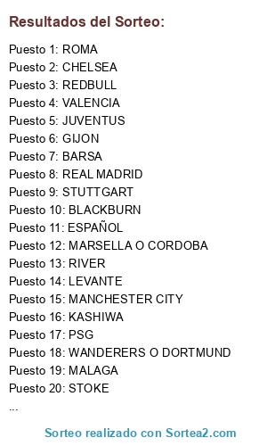 Lista de participantes: FEYENOORD, LIVERPOOL O DORTMUND, BARCELONA, OSMANLISPOR, VILLARREAL, ESPANYOL, TENERIFE, WESTHAM, LEVANTE, CELTIC, CHELSEA, BLACKBURN, CITY, ARSENAL, PSV, UNITED, AJAX, MADRID, DEPOR, SEVILLA, BAYERN, RIVER, VALENCIA, JUVE, BOCA, REDBULL, SPURS, SHAKTHAR, REYSOL, NAPOLES, BETIS, MALAGA.