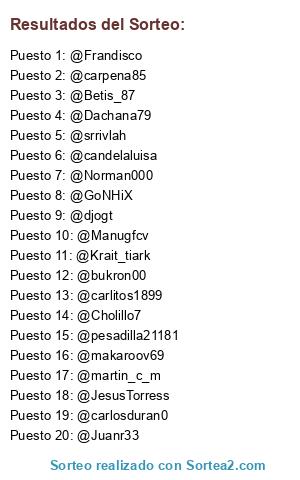 Lista de participantes: @Norman000, @pesadilla21181, @carlosduran0, @Manugfcv, @Frandisco, @djogt, @candelaluisa, @srrivlah, @bukron00, @Krait_tiark, @Betis_87, @martin_c_m, @Dachana79, @JesusTorress, @Juanr33, @makaroov69, @GoNHiX, @carlitos1899, @Cholillo7, @carpena85.