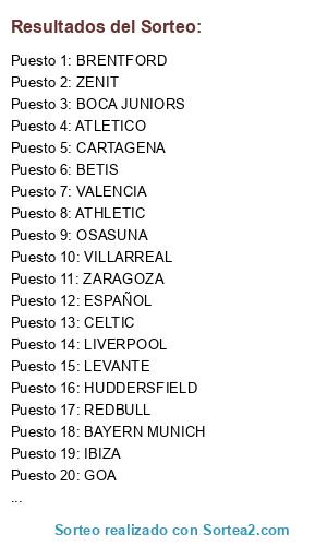 Lista de participantes: CARTAGENA, DORTMUND, LEVANTE, HUESCA, REAL MADRID, INTER DE MILAN, SPORTING DE GIJON, MANCHESTER UNITED, ZENIT, VILLARREAL, OSASUNA, ARGENTINOS, CHELSEA, BARCELONA, PSG, BETIS, ATHLETIC, IBIZA, BAYERN MUNICH, REDBULL, BOCA JUNIORS, ATLETICO, LIVERPOOL, AJAX, ESPAÑOL, VALENCIA, CELTIC, PAULI, GOA, ZARAGOZA, BRENTFORD, HUDDERSFIELD.