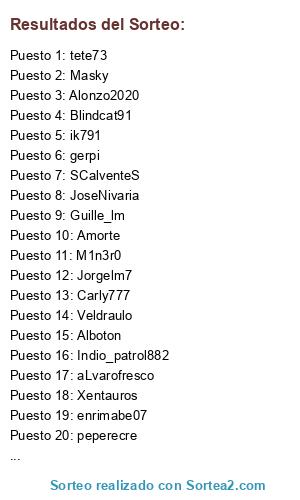 Lista de participantes: Indio_patrol882, Penha69, toni3_13, Agresivo100, Amorte, AntonioperezSFC, gerpi, marlito, enrimabe07, lakylu, peperecre, DiegoRdz82, Sorvolo, El_mercu, cuuuk, Txito21, Jorgelm7, Somango10, mageto, Fbou90, M1n3r0, Globetrotter, romapro, oriolcito11, tete73, Cadista23, Estupeyonk, Alboton, SCalventeS, Kekito_91, kilopsto91, Kaisser, sisqogr, Cartama, JoseNivaria, Masky, ik791, Guille_lm, jonakny, aLvarofresco, Veldraulo, Carly777, Jliy0, Jonyho, Xentauros, Alonzo2020, Blindcat91, delsur_cdz.