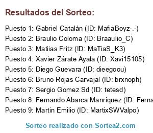Lista de participantes: Diego Guevara (ID: dieegoou), Bruno Rojas Carvajal (ID: brxnoph), Sergio Gomez Sd (ID: tetesd), Xavier Zárate Ayala (ID: Xavi15105), Braulio Coloma (ID: Braaulio_C), Fernando Abarca Manriquez (ID: Fernado07), Gabriel Catalán (ID: MafiaBoyz-.-), Martin Emilio (ID: MartixSWValpo), Matiias Fritz (ID: MaTiaS_K3).