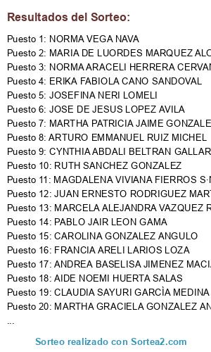 Lista de participantes: ABRAHAM MIRAMONTES SOLIS, ABRIL ANGELINA BARAJAS RIVERA, AIDE NOEMI HUERTA SALAS, ALEJANDRA JOSEFINA DE LA TORRE PORTILLO, ALEJANDRO RUEDAS LUNA, ALEXANDRA PRADO URGIEL, ALEXIA IVONNE ORDUÑA QUIRARTE, ALISON GRACIELA VELASCO VAZQUEZ, ALMA ROCIO PEREZ LETRADO, ALMA RODRIGUEZ CEDEÑO, ALONDRA DÍAZ BARRAGAN, ANA FABIOLA TORRES ORTEGA, ANA GRECIA FIGUEROA CHAVEZ, ANA LUISA MARTINEZ VAZQUEZ, ANA MARICELA ACEVES VIZCARRA, ANA YADIRA MÉNDEZ GUERRERO, ANAID GUZMAN GONZALEZ, ANDREA BASELISA JIMENEZ MACIAS, ANGELA P GARCIA, ANGELICA PATRICIA MORENO PEREZ, ANGELICA TIZCAREÒO DIAZ, ANTONIA ZEPEDA PEÑA, ARACELI KLEEMANN ESPARZA, ARELI LEPE GUILLÉN, ARTURO EMMANUEL RUIZ MICHEL, BEATRIZ DOLORES VALDIVIA AGUILAR, CARLOS ALBERTO MELCHOR DAVILA, CAROLINA GONZALEZ ANGULO, CELIA LUNA MAGALLANES, CESAR EUGENIO ESTRADA MERCADO, CLAUDIA SAYURI GARCÌA MEDINA, CLAUDIA SOLÌS QUINTANAR, CRISTINA JEANETH LUPERCIO SOUZA, CRISTY Z˙ÒIGA GONZ·LEZ, CYNTHIA ABDALI BELTRAN GALLARDO, CYNTHIA CHAVEZ CANALES, DALIA MARGARITA GALVAN ORTIZ, DALINA PALACIOS GARCIA, DAYANE JETZABEL ORTIZ TORRES, DIANA DEL ROCIO GARCÌA Y·ÒEZ, EDGAR EMMANUEL RODRIGUEZ LUGO, ELIA MELISSA JIMENEZ GUTIERREZ, ELIZABETH TRIANA SIORDIA, ELVIA MARGARITA MERCADO DEL ANGEL, ENDIRA KARINA JARA HERNANDEZ, ERIKA DENISSE MARIN CRUZALEY, ERIKA FABIOLA CANO SANDOVAL, ESTHELA GUADALUPE LÛPEZ GUTIÈRREZ, FAVIAN CRUZ MARTÌNEZ, FLOR BRENDA PAOLA QUIÒONES LOPEZ, FRANCIA ARELI LARIOS LOZA, FRANCISCO JAVIER CORNEJO RAZO, FRANCISCO JAVIER LEMUS PONCE, GABRIELA MARGARITA DUR·N HUERTA, GEORGINA ALEJANDRA VIEYRA GARCIA, GLORIA BECERRA ESPARZA, GLORIA CASILLAS GARCIA, GLORIA CRISTINA HARO CASILLAS, GRISELDA CEJA OROZCO, GUADALUPE GONZALEZ CERVANTES, GUSTAVO JAVIER MENDOZA GONZALEZ, HECTOR LECHUGA MORA, HERMELINDA SEGURA MARTINEZ, IA ITZEL REYES OCHOA, IMELDA ESMERALDA BARAJAS SALCEDO, JACQUELINE RAMOS GONZALEZ, JAVIER BECERRA CHAVEZ, JAVIER ZAMORA GUTIÈRREZ, JES˙S ANTONIO CORNEJO PEREZ, JESUS ALEJANDRO ARELLANO MEDRANO, JOEL SALVADOR MORENO GUTIERREZ, JORGE ZAMBRANO DELGADILLO, JOSE DE JESUS LOPEZ AVILA, JOSE MANUEL MAGAÒA BECERRA, JOSEFINA DÌAZ CANTÛN, JOSEFINA NERI LOMELI, JUAN ERNESTO RODRIGUEZ MARTINEZ, KARLA EDWIGES SANCHEZ GONZALEZ, LAURA BEATRIZ CHAVEZ VILLALOBOS, LAURA ELENA S¡NCHEZ TORRES, LAURA MARIA SALAZAR RODRIGUEZ, LETICIA ORTEGA BECERRA, LETY REYES RAMOS, LILIAN MARIANA MARTINEZ CORTES, LORELY DEL VALLE MU—OZ, LORENA ESQUEDA BARRIOS, LUIS ALBERTO CASTILLO CARRILLO, LUIS ROMERO RODRIGUEZ, MAGDALENA VIVIANA FIERROS S·NCHEZ, MANUEL ARTURO NORAMBUENA VALDES, MARCELA ALEJANDRA VAZQUEZ RUVALCABA, MARCELA CANALES MACHUCA, MARGARITA DEYANIRA CASTELLANOS ENRIQUEZ, MARGARITA GARAY TALAVERA, MARGARITA OCHOA BUENROSTRO, MARIA BERTHA OJEDA RAMIREZ, MARIA BIBIANA RAMOS JIMÈNEZ, MARIA CRISTINA HIDALGO GARCIA, MARIA DE LA SALUD GARCIA CASTAÒEDA, MARIA DE LOURDES VELAZQUEZ BARRERA, MARIA DE LUORDES MARQUEZ ALONSO, MARÌA DOLORES OJEDA RAMÌREZ, MARIA ELENA AGUAYO RUA, MARÌA FERNANDA GONZ·LEZ GUTIÈRREZ, MARIA GUADALUPE NAVA GUILLEN, MARIA TERESA GARZA GARCIA, MARICELA GONZALEZ ZEPEDA, MARICELA SERRATOS GUTIERREZ, MARIELA RENGIFO VELA, MARTHA ALICIA CORDERO CAMACHO, MARTHA ESTHELA DEL CARMEN VELARDE GUTIERREZ, MARTHA EUGENIA REYES LA, MARTHA GRACIELA GONZALEZ ANGUIANO, MARTHA LILIA PÈREZ SOTO, MARTHA PATRICIA JAIME GONZALEZ, MELINA VILLASE—OR BASSO, MINERVA LIVIER S·NCHEZ ULLOA, MIRIAM CURIEL LÛPEZ, MISAEL QUIROGA PALACIOS, MONICA BUENROSTRO ROSAS, MONTSERRAT PALOMAR SEGURA, NATALI MARISOL RODRIGUEZ FLORES, NAYELI ALONSO PALACIOS, NAYELI VERONICA GAMA CAHERO, NOEMÌ GUADALUPE VELARDE CAMACHO, NORMA ANGELICA CORTES SEGURA, NORMA ARACELI HERRERA CERVANTES, NORMA SUSANA PARRA TOVAR, NORMA VEGA NAVA, PABLO JAIR LEON GAMA, PALOMA CAROLINA RAMIREZ SANCHEZ, PAOLA ALEJANDRA VALDERRAMA GONZALEZ, PATRICIA MUÒOZ CASTELLANOS, PATRICIA PELAYO LOPEZ, PEDRO SOLORZANO RAMIREZ, PRISCILA GUADALUPE JIMÈNEZ RAMÌREZ, ROBERTO MAXIMILIANO LEON TIRADO, ROSARIO ANGÈLICA LEÛN ESPINOZA, RUTH SANCHEZ GONZALEZ, SAHARA LOPEZ LOPEZ, SANDRA PATRICIA HERNANDEZ MARTINEZ, SUSANA ISABEL BARRIGA OROZCO, SUSANA RODRIGUEZ MONTES, TERESA ALVAREZ MORAN, TERESA DE JES˙S MEZA V·ZQUEZ, TERESITA DE JESUS ROJAS AGUAYO, VANESSA NATALI V·ZQUEZ RIVAS, VANNYA CAROLINA RENTERIA MARTINEZ, VERONICA ELIZABETH NOVOA SANDOVAL, VERONICA GONZALEZ CERVANTES, VERÛNICA MELÈNDEZ LÛPEZ, VIRGINIA MARTINEZ AGUILAR, VIVIANA BALTAZAR MARTINEZ, YADIRA LIVIER AVILEZ MARTINEZ, YAHIR CRISTOPHER ALEXANDER ROSAS RETANA, YANET JAQUELINE EISSA GONZALEZ, YAZMIN VAZQUEZ CARBAJAL.