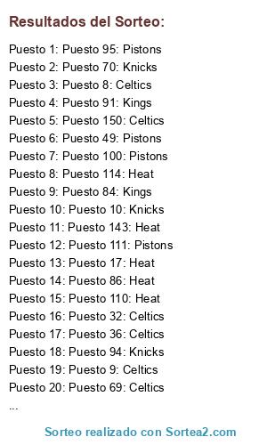 Lista de participantes: Puesto 1: Heat, Puesto 2: Kings, Puesto 3: Heat, Puesto 4: Knicks, Puesto 5: Celtics, Puesto 6: Pistons, Puesto 7: Kings, Puesto 8: Celtics, Puesto 9: Celtics, Puesto 10: Knicks, Puesto 11: Heat, Puesto 12: Knicks, Puesto 13: Knicks, Puesto 14: Heat, Puesto 15: Kings, Puesto 16: Knicks, Puesto 17: Heat, Puesto 18: Celtics, Puesto 19: Celtics, Puesto 20: Heat, Puesto 21: Knicks, Puesto 22: Kings, Puesto 23: Knicks, Puesto 24: Heat, Puesto 25: Celtics, Puesto 26: Celtics, Puesto 27: Pistons, Puesto 28: Knicks, Puesto 29: Knicks, Puesto 30: Celtics, Puesto 31: Celtics, Puesto 32: Celtics, Puesto 33: Celtics, Puesto 34: Kings, Puesto 35: Celtics, Puesto 36: Celtics, Puesto 37: Heat, Puesto 38: Kings, Puesto 39: Heat, Puesto 40: Knicks, Puesto 41: Celtics, Puesto 42: Heat, Puesto 43: Heat, Puesto 44: Kings, Puesto 45: Knicks, Puesto 46: Pistons, Puesto 47: Knicks, Puesto 48: Celtics, Puesto 49: Pistons, Puesto 50: Celtics, Puesto 51: Heat, Puesto 52: Pistons, Puesto 53: Pistons, Puesto 54: Heat, Puesto 55: Pistons, Puesto 56: Pistons, Puesto 57: Pistons, Puesto 58: Heat, Puesto 59: Knicks, Puesto 60: Celtics, Puesto 61: Kings, Puesto 62: Heat, Puesto 63: Knicks, Puesto 64: Celtics, Puesto 65: Pistons, Puesto 66: Kings, Puesto 67: Pistons, Puesto 68: Kings, Puesto 69: Celtics, Puesto 70: Knicks, Puesto 71: Kings, Puesto 72: Celtics, Puesto 73: Kings, Puesto 74: Knicks, Puesto 75: Pistons, Puesto 76: Heat, Puesto 77: Pistons, Puesto 78: Heat, Puesto 79: Kings, Puesto 80: Kings, Puesto 81: Celtics, Puesto 82: Celtics, Puesto 83: Celtics, Puesto 84: Kings, Puesto 85: Knicks, Puesto 86: Heat, Puesto 87: Heat, Puesto 88: Celtics, Puesto 89: Heat, Puesto 90: Pistons, Puesto 91: Kings, Puesto 92: Celtics, Puesto 93: Pistons, Puesto 94: Knicks, Puesto 95: Pistons, Puesto 96: Kings, Puesto 97: Kings, Puesto 98: Kings, Puesto 99: Celtics, Puesto 100: Pistons, Puesto 101: Pistons, Puesto 102: Pistons, Puesto 103: Celtics, Puesto 104: Kings, Puesto 105: Heat, Puesto 106: Knicks, Puesto 107: Knicks, Puesto 108: Kings, Puesto 109: Heat, Puesto 110: Heat, Puesto 111: Pistons, Puesto 112: Heat, Puesto 113: Kings, Puesto 114: Heat, Puesto 115: Celtics, Puesto 116: Heat, Puesto 117: Pistons, Puesto 118: Pistons, Puesto 119: Celtics, Puesto 120: Pistons, Puesto 121: Kings, Puesto 122: Knicks, Puesto 123: Kings, Puesto 124: Pistons, Puesto 125: Celtics, Puesto 126: Knicks, Puesto 127: Kings, Puesto 128: Knicks, Puesto 129: Celtics, Puesto 130: Knicks, Puesto 131: Celtics, Puesto 132: Knicks, Puesto 133: Knicks, Puesto 134: Pistons, Puesto 135: Celtics, Puesto 136: Kings, Puesto 137: Celtics, Puesto 138: Celtics, Puesto 139: Heat, Puesto 140: Knicks, Puesto 141: Knicks, Puesto 142: Pistons, Puesto 143: Heat, Puesto 144: Heat, Puesto 145: Knicks, Puesto 146: Heat, Puesto 147: Heat, Puesto 148: Kings, Puesto 149: Celtics, Puesto 150: Celtics.