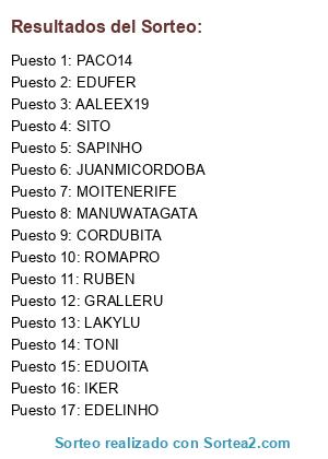 Lista de participantes: PACO14, EDELINHO, JUANMICORDOBA, TONI, EDUFER, GRALLERU, IKER, EDUOITA, AALEEX19, SITO, MOITENERIFE, LAKYLU, SAPINHO, RUBEN, MANUWATAGATA, ROMAPRO, CORDUBITA.