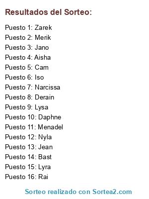 Lista de participantes: Aisha, Bast, Zarek, Lysa, Narcissa, Lyra, Rai, Merik, Jano, Menadel, Cam, Jean, Daphne, Derain, Iso, Nyla.