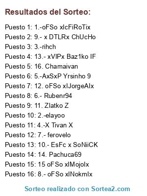 Lista de participantes: 1.-oFSo xIcFiRoTix, 2.-elayoo, 3.-rihch, 4.-X Tivan X, 5.-AxSxP Yrsinho 9, 6.- Rubenr94, 7.- ferovelo, 8.- oFSo xINokmIx, 9.- x DTLRx ChUcHo, 10.- EsFc x SoNiiCK, 11. Zlatko Z, 12. oFSo xIJorgeAIx, 13.- xVIPx Baz1ko IF, 14. Pachuca69, 15 oFSo xIMojoIx, 16. Chamaivan.