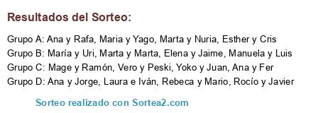 Lista de participantes: Elena y Jaime, Maria y Yago, Yoko y Juan, Rocío y Javier, Ana y Jorge, Manuela y Luis, Vero y Peski, Laura e Iván, María y Uri, Marta y Marta, Ana y Rafa, Rebeca y Mario, Marta y Nuria, Esther y Cris, Ana y Fer, Mage y Ramón.