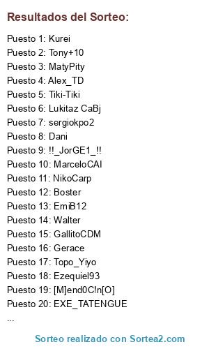 Lista de participantes: Jaamen, GallitoCDM, [M]end0C!n[O], Gerace, Dani, EmiB12, Topo_Yiyo, Mathee, Guido, AleLXColon, Jigsaw, Gapa, Mellu, Juanma+10, Rodriakd, MatyPity, AgusCuervo, S, Boster, NikoCarp, Jero, Windem, Exe, Guille, NikoArg, Alex_TD, July, Pocho, Chumi, sergiokpo2, Menduko, N, Corto, Walter, Kurei, Tony+10, Briancitu, Maschi, Tiki-Tiki, El-Mafia, Defensayjus, Machi, Lucas.B, Joga, Koko, Guidoleproso, (Alexsitho), Bob_Tricolor, El_Animal, ilusso, Beto_tony, Sebalima, Ariel.G, Jubilado, Matiaz, Franco_Racing, Eliamm, Locox, Azul_Francia, Eber, Molito, Lo ARTESANAL, Ezequiel93, !!_JorGE1_!!, JR_RIQUELME (no_lag), MatyRC, Duftin, Tanitu, Tala-Brasil, EXE_TATENGUE, Ruperto, ~Fede·AKD, Lukitaz CaBj, Zinho, MarceloCAI, muejejeje(ebarok).