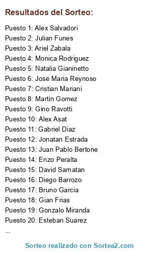 Lista de participantes: Gabriel Quintero, Gabriel Quintero, Gabriel Quintero, Gabriel Quintero, Gabriel Quintero, Gabriel Louise, Gabriel Louise, Gabriel Louise, Gabriel Louise, Gino Ravotti, Gino Ravotti, Gino Ravotti, Alan Rochetti, Alan Rochetti, Alan Rochetti, Alan Rochetti, Alex Salvadori, Alex Salvadori, Alex Salvadori, Alex Salvadori, Ariel Zabala, Ariel Zabala, Ariel Zabala, Ariel Zabala, Ariel Zabala, Gonzalo Miranda, Gonzalo Miranda, Gonzalo Miranda, Gonzalo Miranda, Gonzalo Miranda, Julian Funes, Julian Funes, Alex Asat, Alex Asat, Alex Asat, Alex Asat, Cristian Aguilera, Cristian Aguilera, Cristian Aguilera, Cristian Aguilera, Cristian Aguilera, Gabriel Diaz, Natalia Gianinetto, Gian Frias, Dario Falco, Dario Falco, Dario Falco, Dario Falco, Dario Falco, Matias Figueroa, Juan Pablo Bertone, Juan Pablo Bertone, Juan Pablo Bertone, Juan Pablo Bertone, Juan Pablo Bertone, Martin Gomez, Martin Gomez, Martin Gomez, Martin Gomez, Martin Gomez, Jose Maria Reynoso, Jose Maria Reynoso, Bruno Garcia, Michel Echevarria, Sebastian Devia, Sebastian Devia, Jonatan Estrada, Matias Rivero, Diego Barrozo, Diego Barrozo, Diego Barrozo, Diego Barrozo, Diego Barrozo, Sebastian Salinas, Esteban Suarez, Esteban Suarez, Esteban Suarez, Esteban Suarez, Esteban Suarez, Cristian Mariani, Cristian Mariani, Cristian Mariani, Cristian Mariani, Cristian Mariani, David Samatan, David Samatan, David Samatan, David Samatan, David Samatan, Enzo Peralta, Enzo Peralta, Monica Rodriguez, Monica Rodriguez, Monica Rodriguez, Monica Rodriguez, Monica Rodriguez.