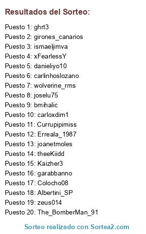 Lista de participantes: Albertini_SP, Erreala_1987, zeus014, Currupipimiss, The_BomberMan_91, theeKiidd, carloxdim1, carlinhoslozano, ghrt3, wolverine_rms, joselu75, danieliyo10, garabbanno, ismaeljimva, Colocho08, Kaizher3, xFearlessY, girones_canarios, joanetmoles, bmihalic.