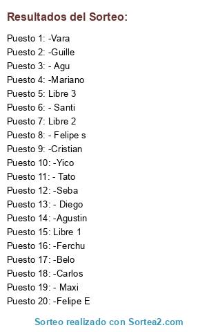 Lista de participantes: Diego, Ferchu, Guille, Maxi, Seba, Felipe s, Belo, Agustin, Mariano, Vara, Yico, Agu, Carlos, Santi, Tato, Felipe E, Cristian, Libre 1, Libre 2, Libre 3.