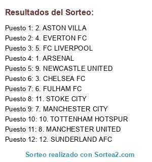 Lista de participantes: 1. ARSENAL, 2. ASTON VILLA, 3. CHELSEA FC, 4. EVERTON FC, 5. FC LIVERPOOL, 6. FULHAM FC, 7. MANCHESTER CITY, 8. MANCHESTER UNITED, 9. NEWCASTLE UNITED, 10. TOTTENHAM HOTSPUR, 11. STOKE CITY, 12. SUNDERLAND AFC.