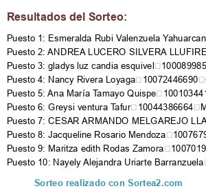 Lista de participantes: Ana María Tamayo Quispe 10010344163 Celia, ANDREA LUCERO SILVERA LLUFIRE 10009702901 MARITZA EDITH RODAS ZAMORA, Aylene Ashley Ysla Mendoza 10072902788 Carmen Salazar, CESAR ARMANDO MELGAREJO LLANCO 10009685697 NORMA ALICIA AQUINO ALVAREZ, Dora Canturin polo 10008796562 Carmen Salazar, Esmeralda Rubi Valenzuela Yahuarcani 10075357511 Maritza, gladys luz candia esquivel 10008998591 roxana, Greysi ventura Tafur 10044386664 Maritza, Jacqueline Rosario Mendoza 10076793012 Maritza, Julia Rosa Llufire Lucero 10009702901 Maritza Edith Rodas Zamora, kelly orbegozo echevarria 10041007592 lis, Lucy milla lopez 10006908495 Norma, Maritza edith Rodas Zamora 10070190924 Maritza rodas, Marjorie Beatriz Amparo Retto Polo 10048239439 Roxana de la Cruz, Maruja Tantalean Carranza 10046342508 Roxana de la cruz, Medalit Calderon Retamozo 10090037493 Eskarly equipo 11, Mónica del Carmen Romero Flores 10007629599 Maritza, Nancy Rivera Loyaga 10072446690 Celia, Nayely Alejandra Uriarte Barranzuela 10072035306 Erika Cunya, Nelly Isabel Tadeo Rojas 10010090086 Mariza, Olga nancy Bravo segundo 10009265503 Norma aquino, Yessica Rodas Herrera 10076602936 Irma.