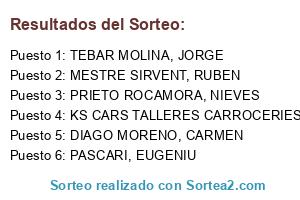 Lista de participantes: NAAYEN COLLADO, MARINUS ADRIAAN, LOPEZ GRAU, SERGIO, ALIAS JIMENEZ, JUAN ANTONIO, PINTADO MUÑOZ, JUAN FRANCISCO, RIOS BRENES, JUAN, FUSTER GARCIA, JOSE RAMON, DIAZ GIL, MANUEL, PASCARI, ION, CERRAJERIA JOSE SALORT SAPENA, S.L., LOPEZ FENOLLAR, MIGUEL, LOPEZ MOYA, MARIO DAMIAN, PEREZ GARCIA, IGNACIO, COSMIDIS MONTORO, VICENTE, CARRASCOSA ALBERT, CRISTINA, RAMIREZ ARIZA, ALICIA, ARTEAGA CASTRO, SANDRA VIRGINIA, CALERO MERIDA, ASUNCION, VENGUT MARCO, JOSE ANTONIO, BERENGUER CANTO, ESTEBAN, SUMMIT PERFORMANCE S.L., CATALA BLANES, LUIS, LOPEZ PEREZ, FELIX, SAN ISIDRO HIDALGO, LUCIA, TORMO GIL, MARIA, LOPEZ ARAQUE, BEGOÑA, PARDO ESTUDILLO, JOSE MARIA, ALEMANY BLEDA, CARLOS, GARCIA VARO, JOSE PASCUAL, FLOQUET, MICHEL DANIEL, SUCESORES DE JULIAN SILVESTRE, SL, GIL VIDAL, FRANCISCO, SÁNCHEZ ALCOLADO, MIGUEL ANGEL, FELICIANO GISBERT, S.L., LOPEZ POVEDA, ANTONIO, GUILLEN CERVANTES, DOLORES, VISAUTO, S.L., BELTRAN GONZALEZ, ERNESTO, SUAREZ EXPOSITO, RAFAEL, MESTRE SIRVENT, RUBEN, ROMERO MURIAS, MONICA, RAMOS CABEZA, FELIPE, GUERRERO RODRIGUEZ, RAFAEL, AUTOSAX, S.L., PEREZ MILLA, JOSE ANTONIO, CANILLAS ALONSO, ANTONIO, HERNANDEZ ANZANO, JOSE JOAQUIN, GONZALEZ SANCHEZ, PEDRO, SHAHZAD SHAHZAD, JAFFAR, TEBAR MOLINA, JORGE, VERRONE, LUIS ANTONIO, LUCAS MAGRO, FEDERICO, MALVEMTI BELLIDO, ANIELO DIMITRI, CREMADES MESTRE, LAURA, EXPLOTACION GANADERA HERMANOS GARCIA, S., FONBERSUR SL, FRANCISCO MOLTO BENIMELI, S.L, TOP BATTERIE IBERICA, S.L.U., LA COSTA PEIX FRESC, S.L., MOLLA ABAD, GERMAN ISIDRO, REINA ALCOLEA, LUIS, JORCAR CARRETILLAS, S.L., GRUPO DSH HIGIENE S.L.U, PEREZ PRATS, LEOPOLDO, FEZZAGA FEZZAGA, HASSAN, AUTOESCUELA COLOMER, S.L., TERRES RIQUELME, MIGUEL ANGEL, RUIZ PERALTA, NICOLAS, CAMPOS SENDRA, JUAN CARLOS, CATALA OLTRA, SABINA, BARREDA LLOMBART, ANGEL, RODENAS NAVARRO, JOSE MANUEL, RAJA HERNANDEZ, RAFAEL, RUIZ IVAÑEZ,S.L., CORNEJO BUTRON, MANUEL, BERMEJO LAGUNA, FRANCISCO JAVIER, VALLS ORTS, ANTONIO FRANCISCO, ZALAZAR RODWAY, JOSE ALBERTO, IBAÑEZ IBAÑEZ, ANTONIO, AZNAR ORENES, ROBERTO CARLOS, LOZANO ALVADO, Fº JAVIER, RUIZ ORTEGA, AURORA, MIRA SAVALL, JORGE, TORRES LEAL, JACINTO, RUIZ DIAZ, MIGUEL ANGEL, SEMPERE VAÑO, OSCAR IGNACIO, APARICI PASTOR, RUBEN, PASTOR COLOMA, PAOLA, LEON SAN JORGE, JUANA, MOLDES RIOBO, JOSE, MARFIL PICON, ENRIQUE, CAMPILONGO, ALEJANDRO JAVIER, LLARIO MOSCARDO, INES, SERRANO WOODHEAD, MATEO, MORENO PEREZ, MARIA CARMEN, LLOPIS FERRANDO, JOSE FRANCISCO, SANTAOLIVA GUERRERO, DAVID, VALENTIN ROMERO, YOLANDA, SERRANO OLMEDO, SALVADOR FERNANDO, VAYA REYES, ALFONSO M., ARAGON FLORES, MIGUEL, MARTIN PEREA, EVA DE LA CRUZ, KS CARS TALLERES CARROCERIES, S.L., BONET AGULLO, MARIA FRANCISCA, VIRUES ROJAS, MARCOS, GALVEZ ALCOBA, ANTONIO, HERMOSILLA LOPEZ, JOSEFA, SAN PEDRO COURIER, S.L., BAIZAN ORTIZ, ANA MARIA, GONZALEZ PASTOR, ANDRES, MARTIN ROMERO, ROBERTO, BENAVENT CARBONELL, SALVADOR, FONTSEVIPUERTO, S.L., ESPINAR DELGADO, ANTONIO JOSE, PRIETO ROCAMORA, NIEVES, HAKOUMI HAKMI, HAKKOUM, PEREZ MILLA, MIGUEL, A.M.PROYECCIONES DEPORTIVAS XXI,S.L, ACOSTA MOYA, FULGENCIO, VITORIA RIPOLLES, MARIA CARMEN, PASCARI, EUGENIU, SANCHEZ BURGOS, RAQUEL, BAEZ VILLAGRA, LEANDRO, CHASTEL COSTA, ENRIQUE, COBELO HUELVA, MANUEL, DALIAN IMPORT-EXPORT, S.L., TORMOS CRESPO, IVAN, CLIMENT AGUD, JUAN GABRIEL, ALUMINIO TRES CAMINOS, S.L., ANTONIO ARACIL MARTINEZ, S.L., MANZANARO LOPEZ, JESUS IGNACIO, DIAGO MORENO, CARMEN, RODRIGUEZ DIAZ, FATIMA, LETRAN RUBIO, FLORENTINA.