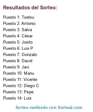 Lista de participantes: Javi, Josito, Pepe, Manu, Luis P, Antonio, David, Gonzalo, Diego C, Vicente, Salva, Txetxu, César, Luis.