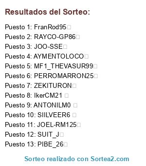 Lista de participantes: JOO-SSE✅, ANTONILM0 ✅, SUIT_J✅, PIBE_26✅, PERROMARRON25✅, JOEL-RM125✅, AYMENTOLOCO✅, SIILVEER6 ✅, MF1_THEVASUR99❓, ZEKITURON✅, FranRod95✅, RAYCO-GP86✅, IkerCM21 ✅.